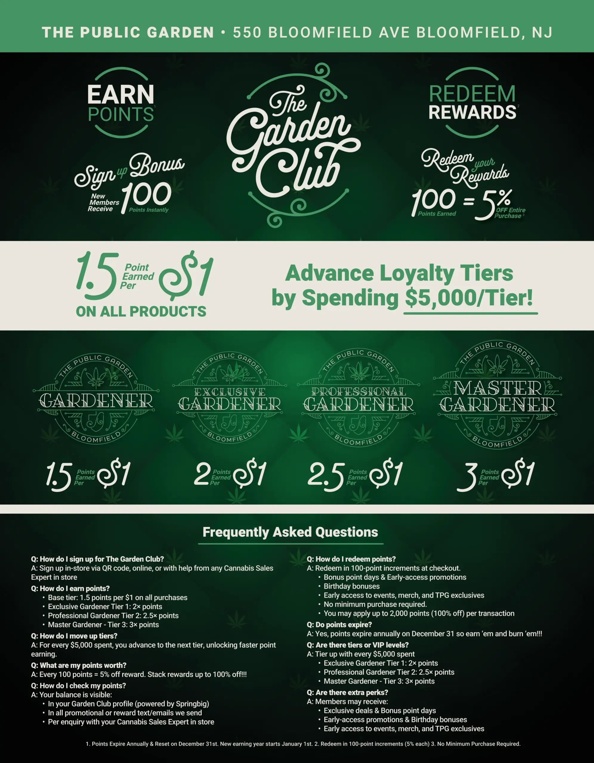 Welcome to The Garden Club, the official loyalty program at Public Garden Dispensary, located at 550 Bloomfield Ave, Bloomfield, NJ. Our rewards program is designed to give cannabis shoppers more value, more savings, and exclusive access—every time you visit.
